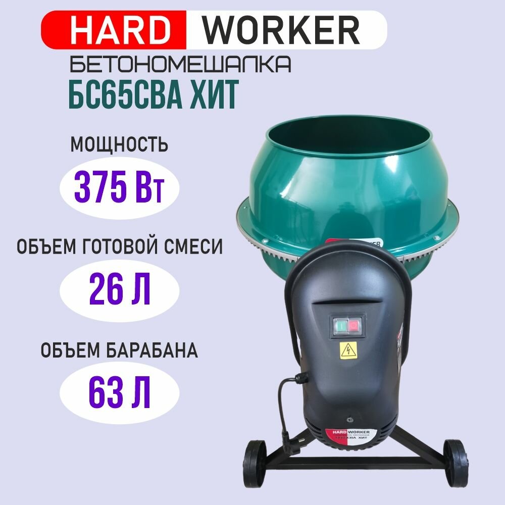 Бетономешалка строительная HARD WORKER БС65СВА ХИТ сегментный венец из алюминиевого сплава, объем 63 литров, мощность 375 Вт, бетоносмеситель электрический интересное:
