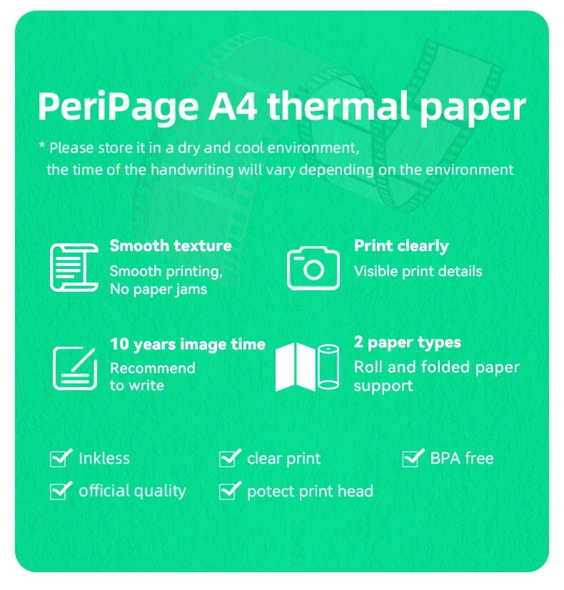 Мини-принтеры A4 PeriPage, быстросохнущая и длительное хранение, непрерывная термобумага, 100 листов, сложенная термобумага интересное: