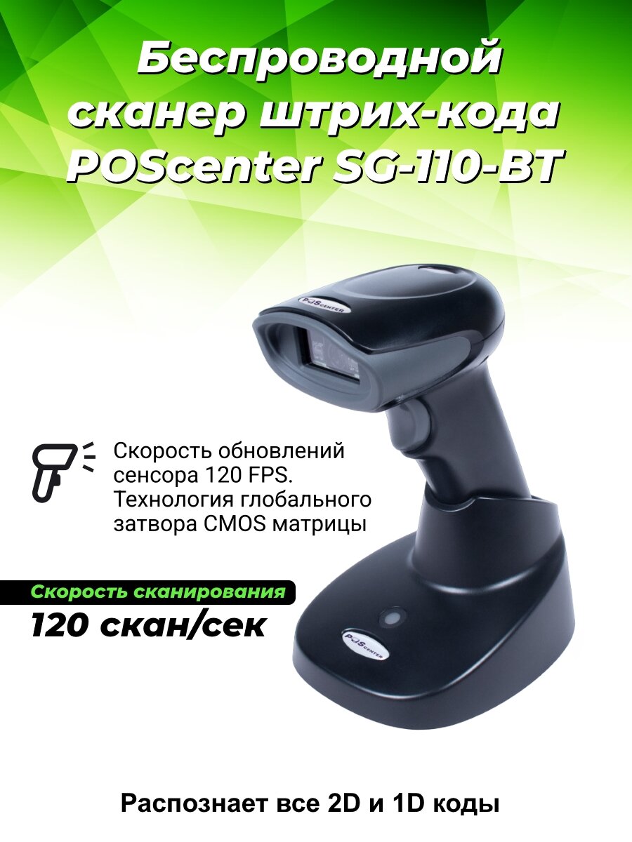 Купить Сканер штрих-кода POScenter SG-110-BT, беспроводной, адаптер 2.4G, 1.5 м, кредл