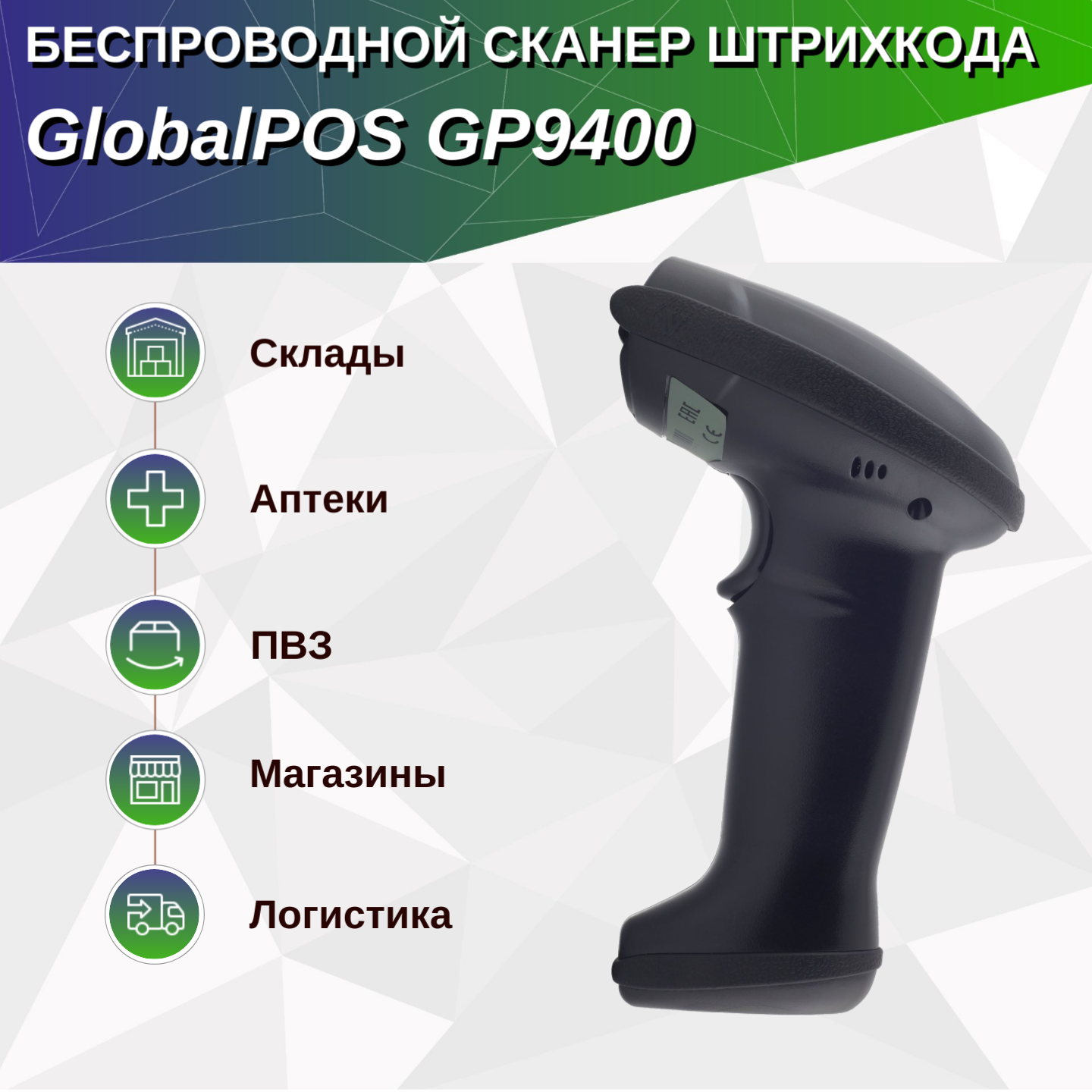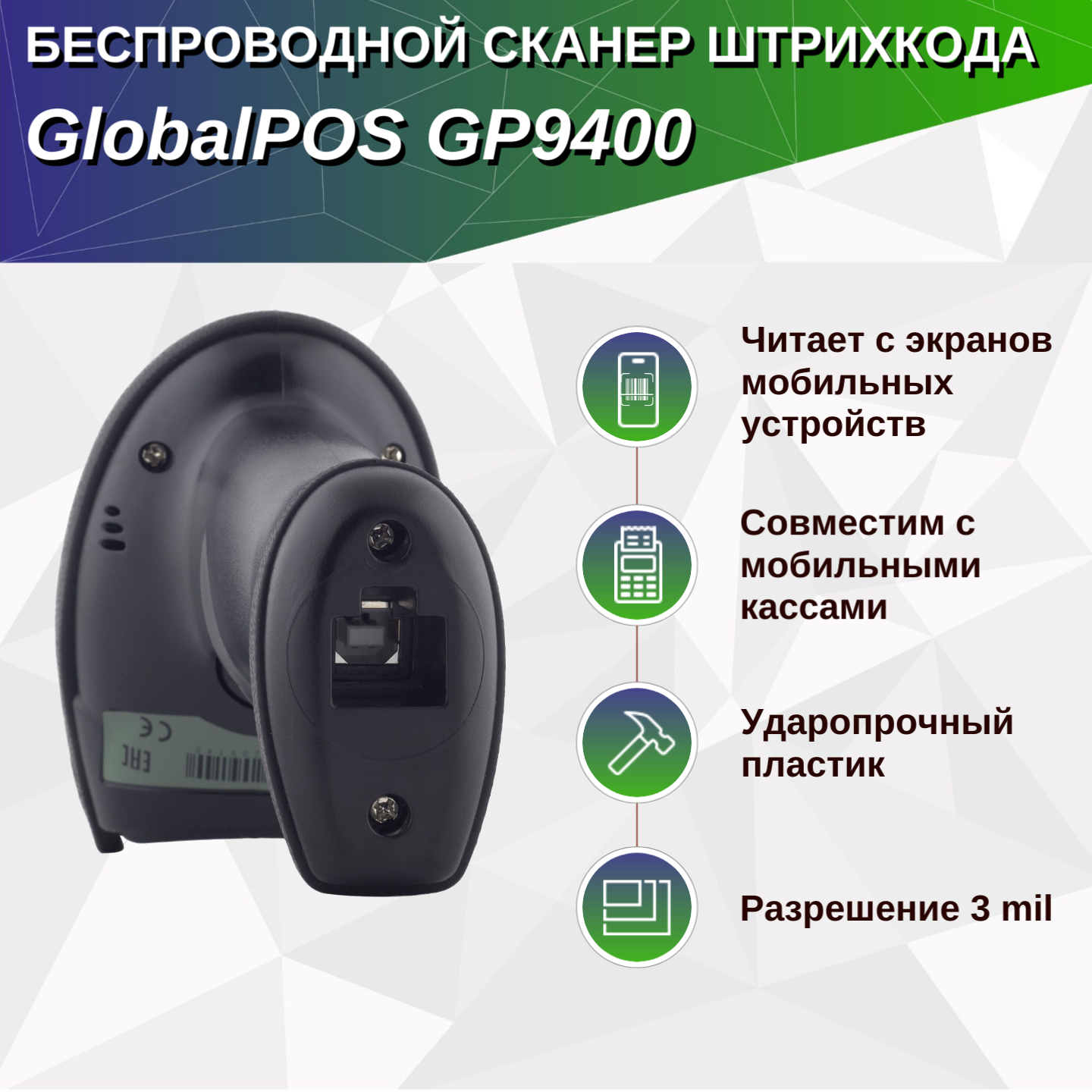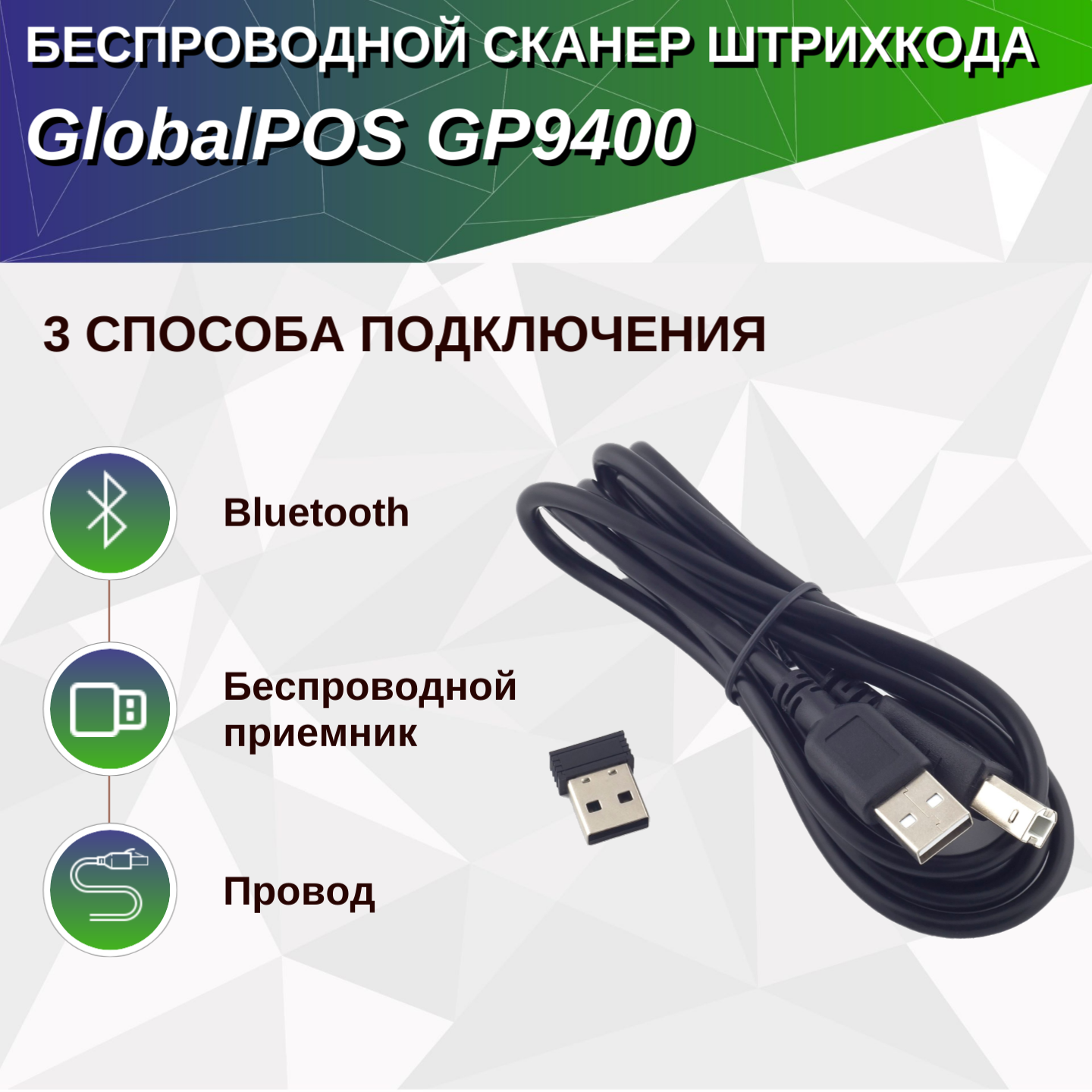 Сканер штрихкода GlobalPOS GP-9400B 2D, беспроводной, Bluetooth, USB интересное: