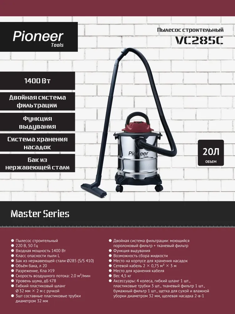 Пылесос строительный бытовой с насадками Pioneer VC285C, 20 л, двойная система фильтрации, функция выдува, сбор жидкости, 1400 Вт интересное: