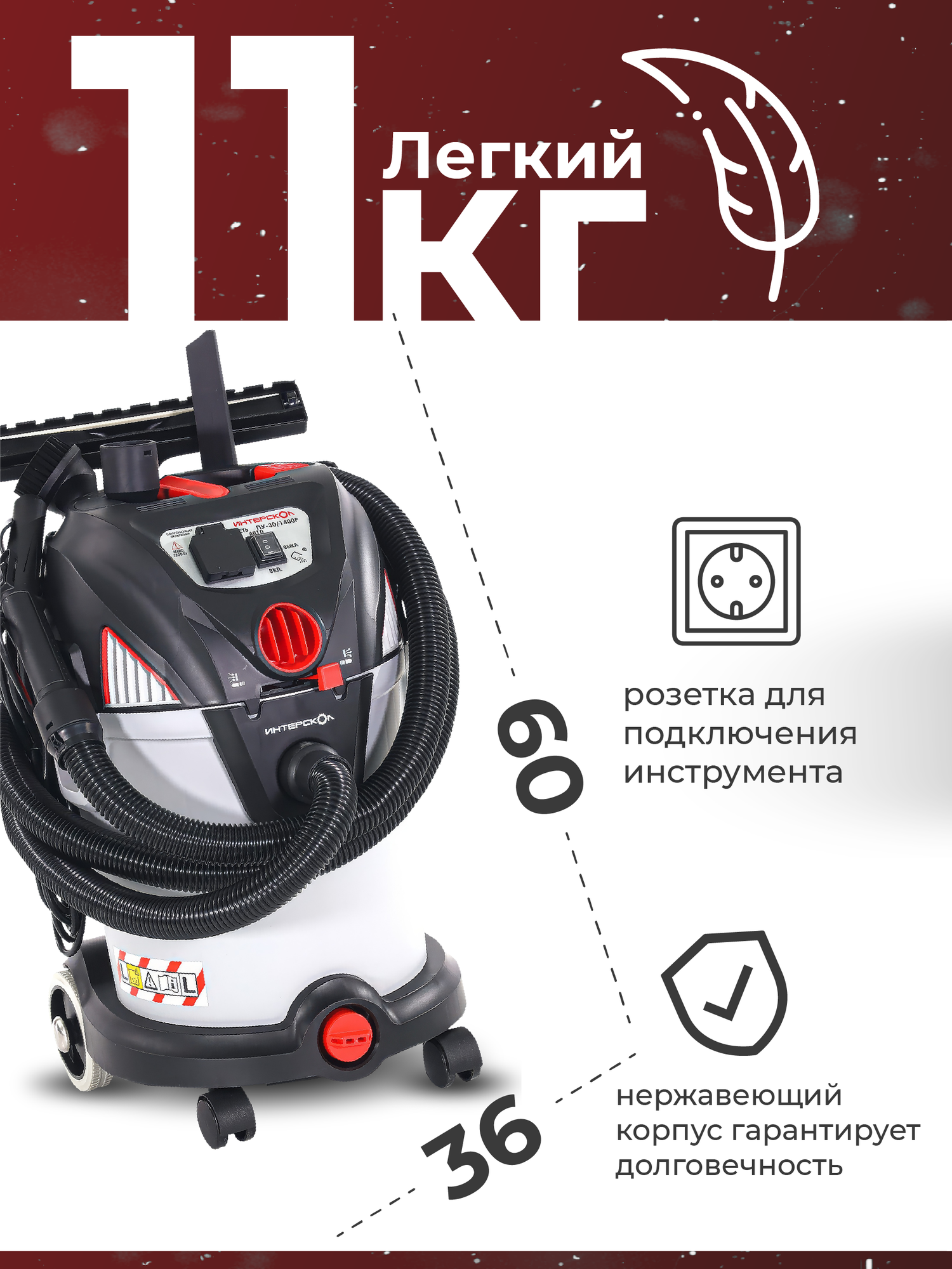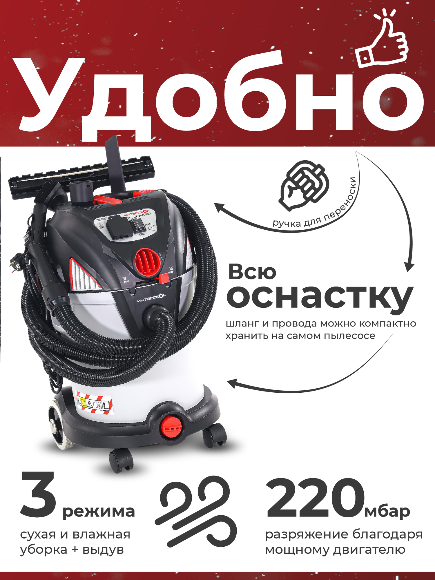 Интерскол ПУ-30/1400Р Строит. пылесос (сух./влаж. уборка, розетка с синхр.) + 61130.303 компл. мешков в подарок интересное: