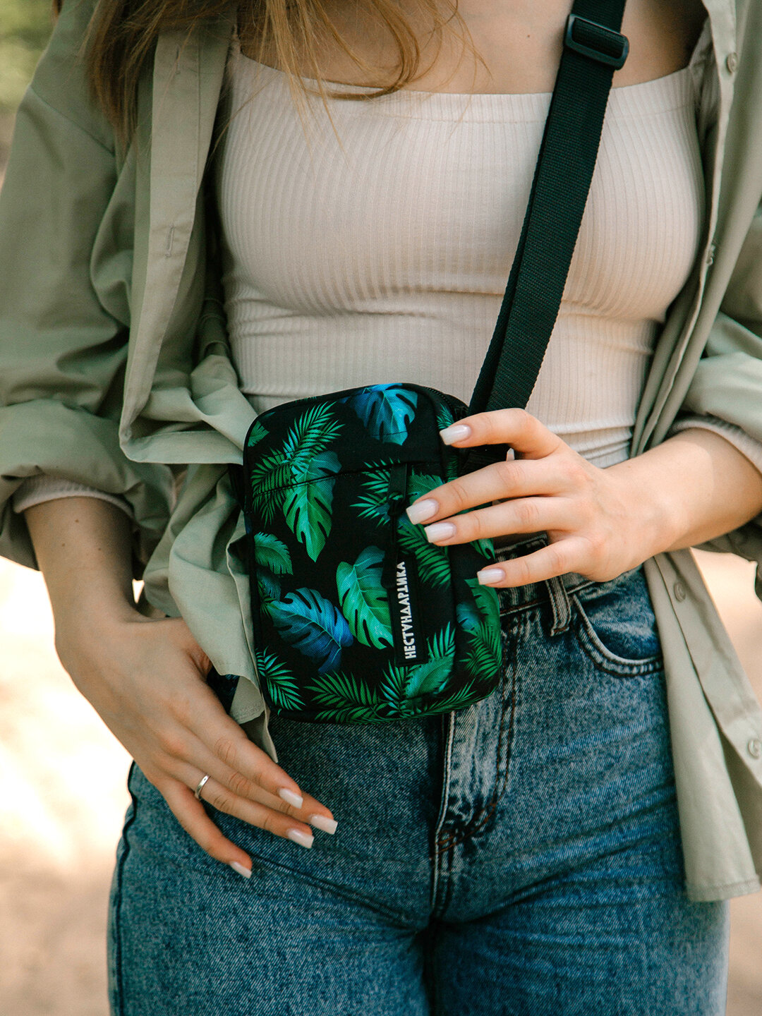 СохранитьМини-сумка мессенджер женская, мужская через плечо для телефона с принтом Тропические листья интересное: