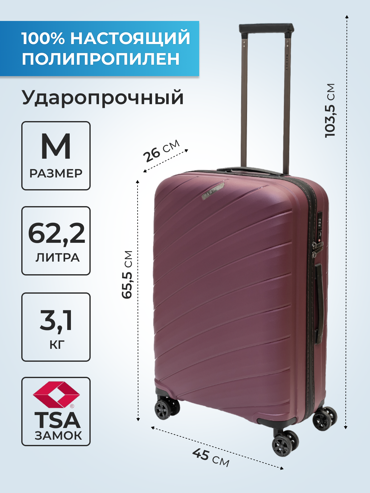 Чемодан на колесах Baudet 821-66,5см (фиолетовый/черный) M, 62,2 л интересное: