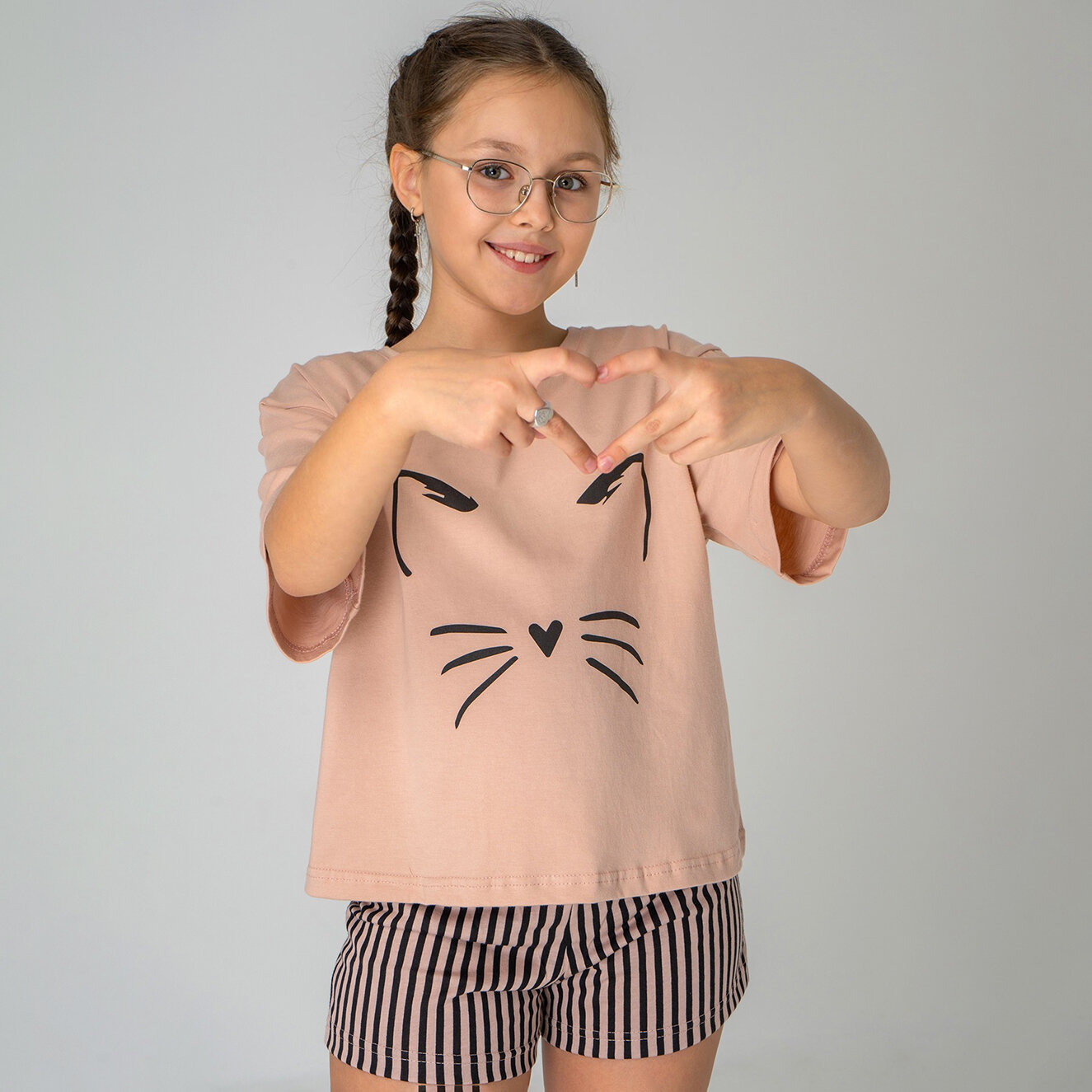 Пижама детская для девочки с шортами, HappyFox, HF5900DSP размер 140, цвет бежевый,полосы.на.пудре