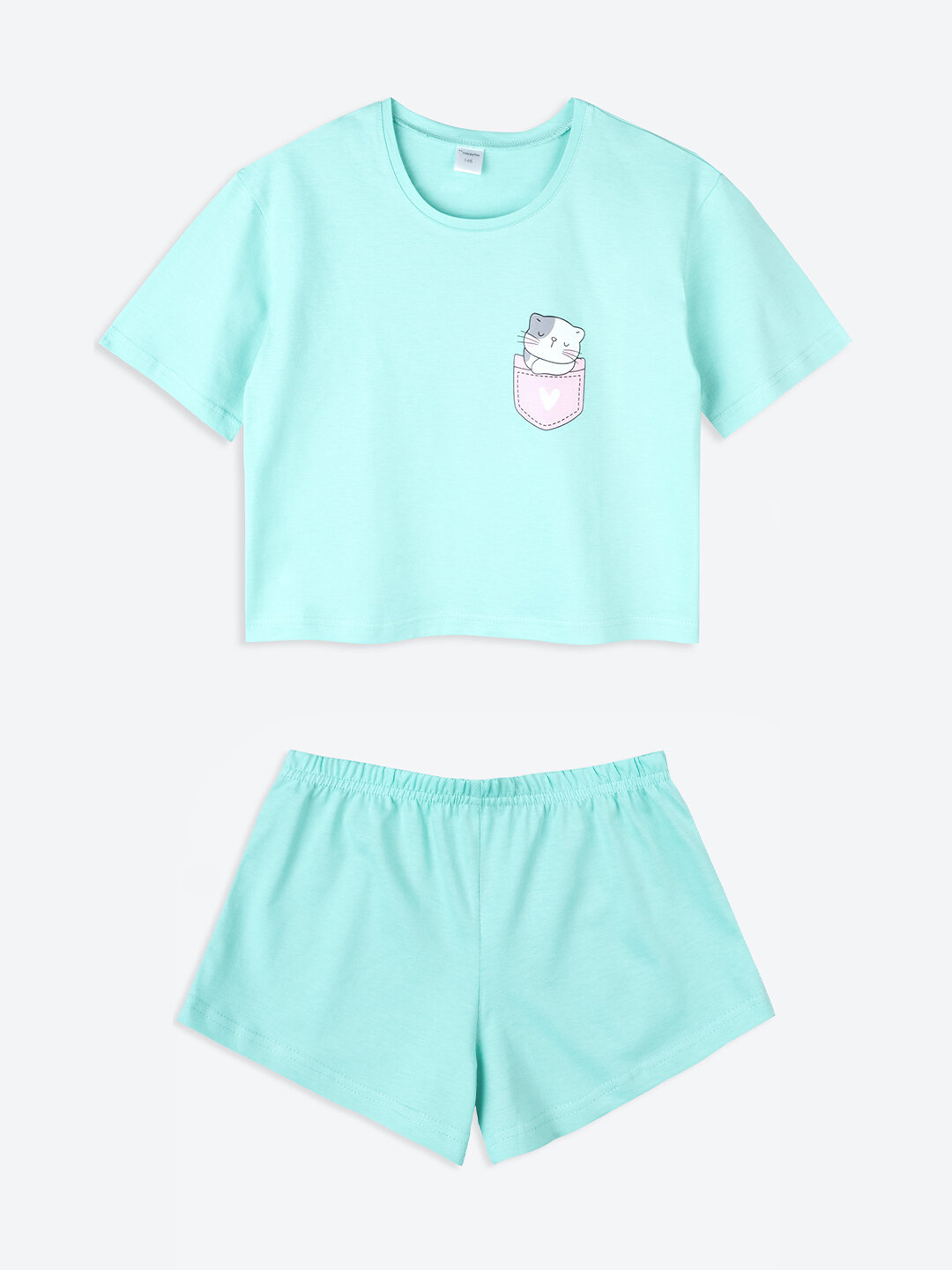 Пижама для девочки хлопковая для подростков HappyFox HF5900DSP котик.в.кармашке.ментол 128