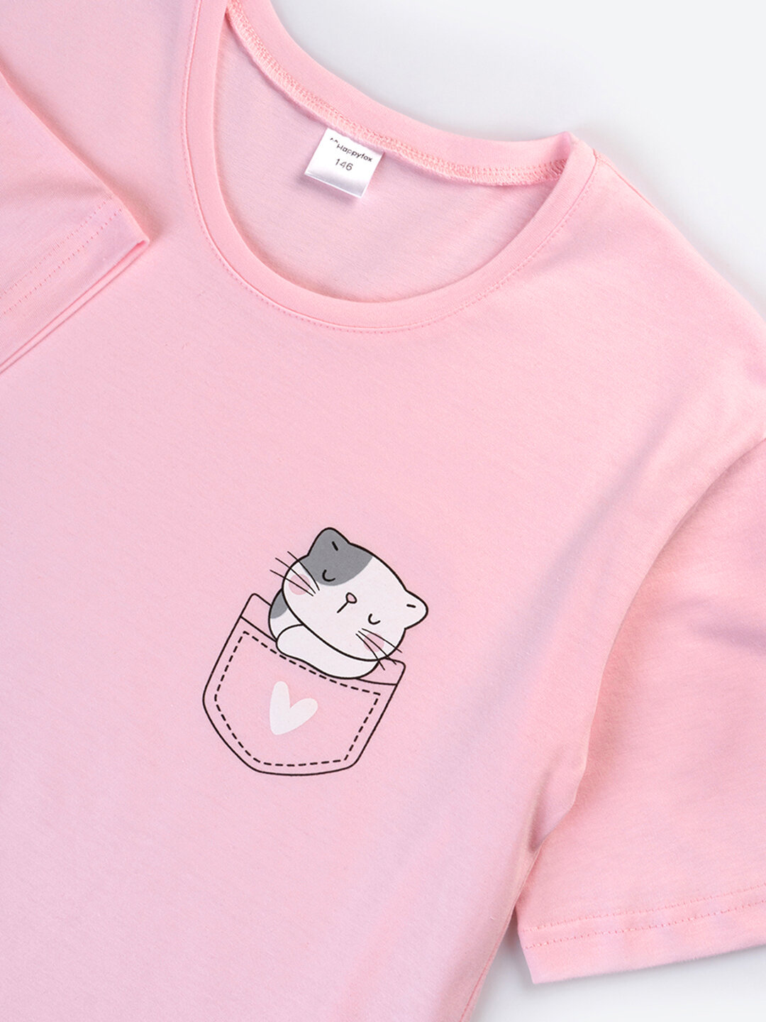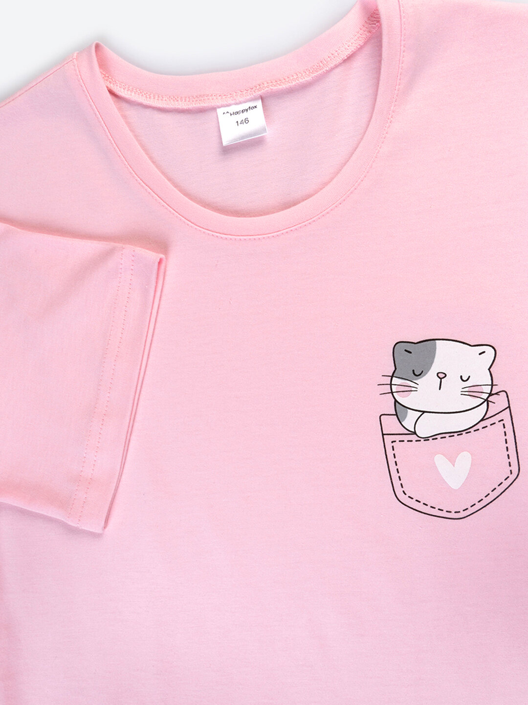 Пижама для девочки хлопковая для подростков HappyFox HF5900DSP котик.в.кармашке.розовый 128