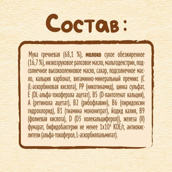 | Состав | мука гречневая / молоко сухое обезжиренное / низкоэруковое рапсовое масло / подсолнечное высокоолеиновое масло / подсолнечное масло / кальция карбонат / соль / витаминно- минеральный премикс (С (L-аскорбиновая кислота) / РР (никотинамид) / цинка сульфат / E (DL-альфа-токоферола ацетат) / B5 (D-пантотенат кальция) / A (ретинола ацетат) / В2 (рибофлавин) / В6 (пиридоксин гидрохлорид) / В1 (тиамина мононитрат) / йодид калия / B9 (фолиевая кислота) / D (D3 холекальциферол)) / железа (II) фумарат / бифидобактерии не менее 1х106 КОЕ/г / антиокислители (альфа-токоферол (содержит сою) / L-аскорбилпальмитат). Продукт может содержать глютен. |