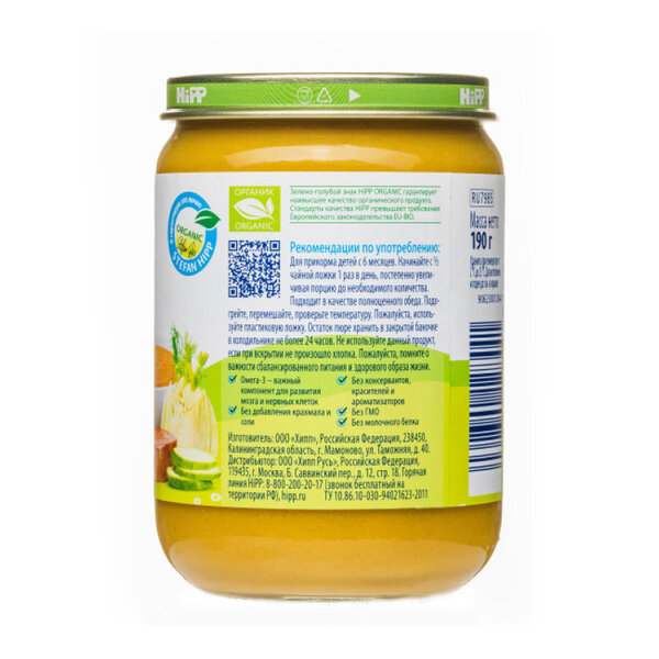 | Состав | кабачок / морковь / фенхель / картофель / мясо индейки / мука рисовая грубого помола (для консистенции) / масло рапсовое / зелень укропа сушеная / тмин молотый / вода (для приготовления) |