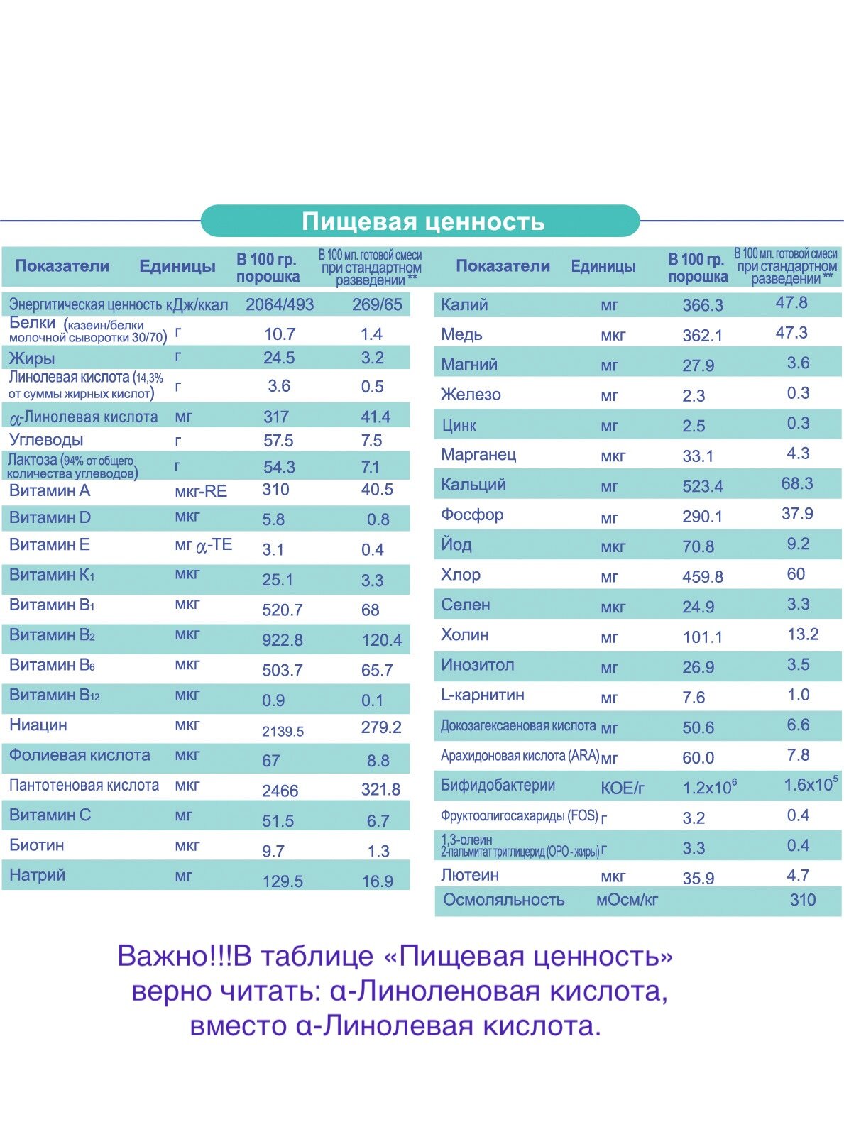 | Состав | деминерализованная овечья молочная сыворотка / смесь растительных масел (кукурузное / рапсовое / кокосовое / подсолнечное / соевое) / козье молоко / 1,3-олеин 2-пальмитат триглицерид (OPO жиры) / фруктоолигосахариды (FOS) / L-карнитин тартрат / витамины: (витамин A / витамин D / витамин E / витамин K1 / витамин B1 / витамин B2 / витамин B6 / витамин B12 / витамин C) / ниацин / фолиевая кислота / пантотеновая кислота / биотин / холин / инозитол / минералы (селенит натрия / цитрат натрия / иодид калия / карбонат калия / сульфат меди / сульфат магния / сульфат железа / сульфат цинка / сульфат марганца / карбонат кальция / трикальция фосфат / хлорид калия) / фосфолипиды / (омега -6) арахидоновая кислота / (омега - 3) докозагексаеновая кислота / пробиотики (бифидобактерии Bb-12) / лютеин |