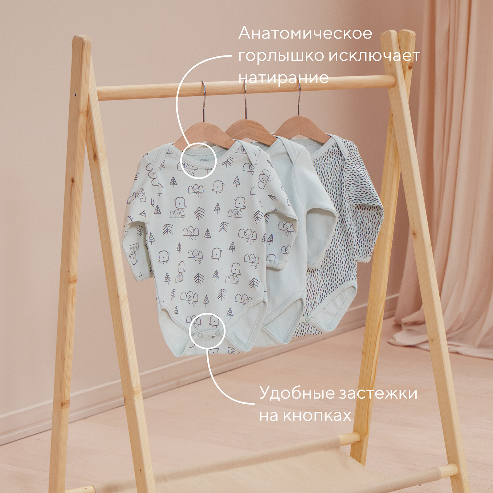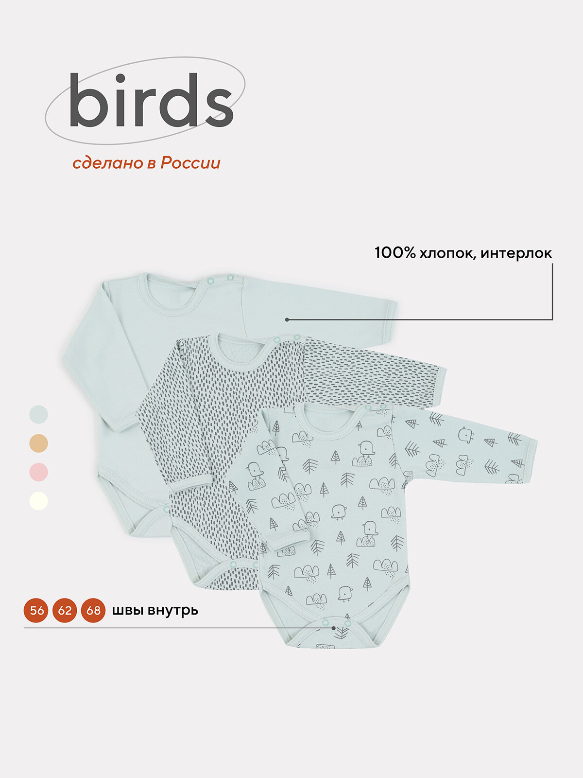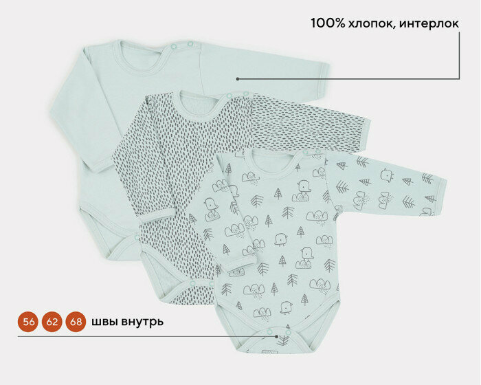 Боди с длинным рукавом MowBaby Birds Blue 6182 р.62 (3шт. в уп.) интересное: