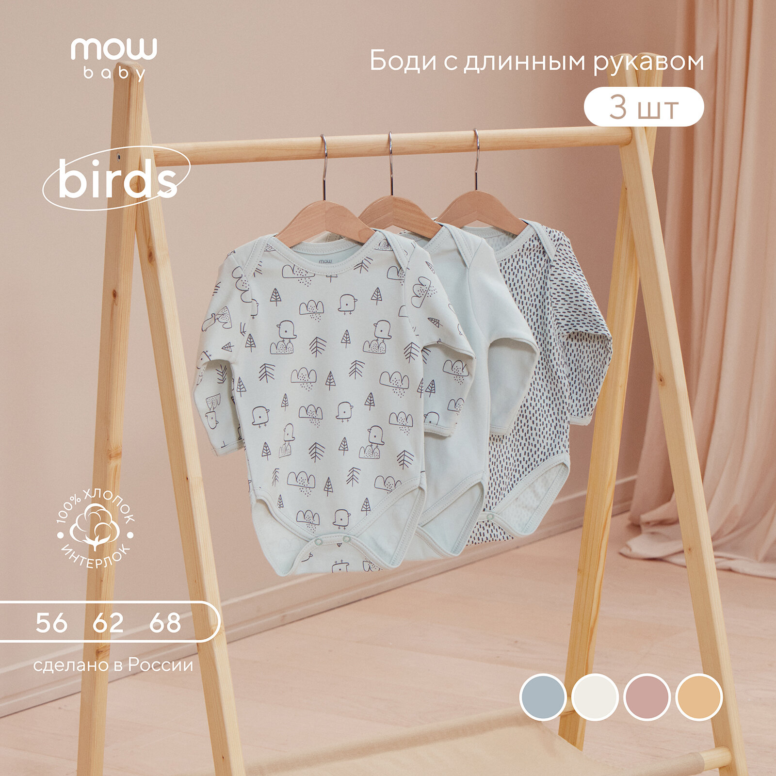 Боди с длинным рукавом MowBaby Birds Milk 6182 р.62 (3шт. в уп.)