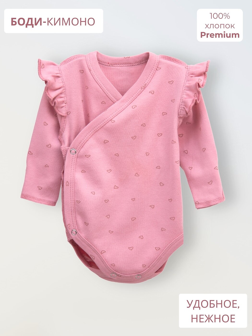 Боди кимоно Bebo, с рюшами с длинным рукавом на кнопках с антицарапками, Сердечки на розовом, размер 62 см