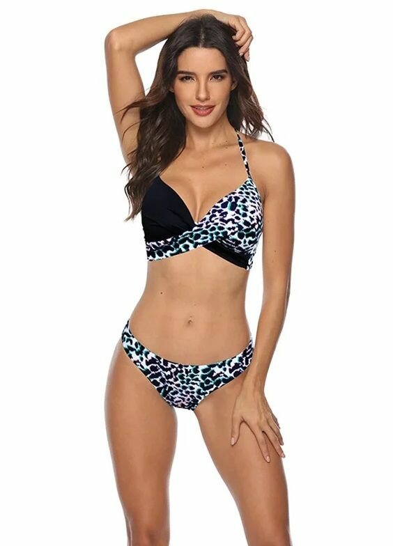 Раздельный купальник с анималистическим принтом и цветными пятнышками