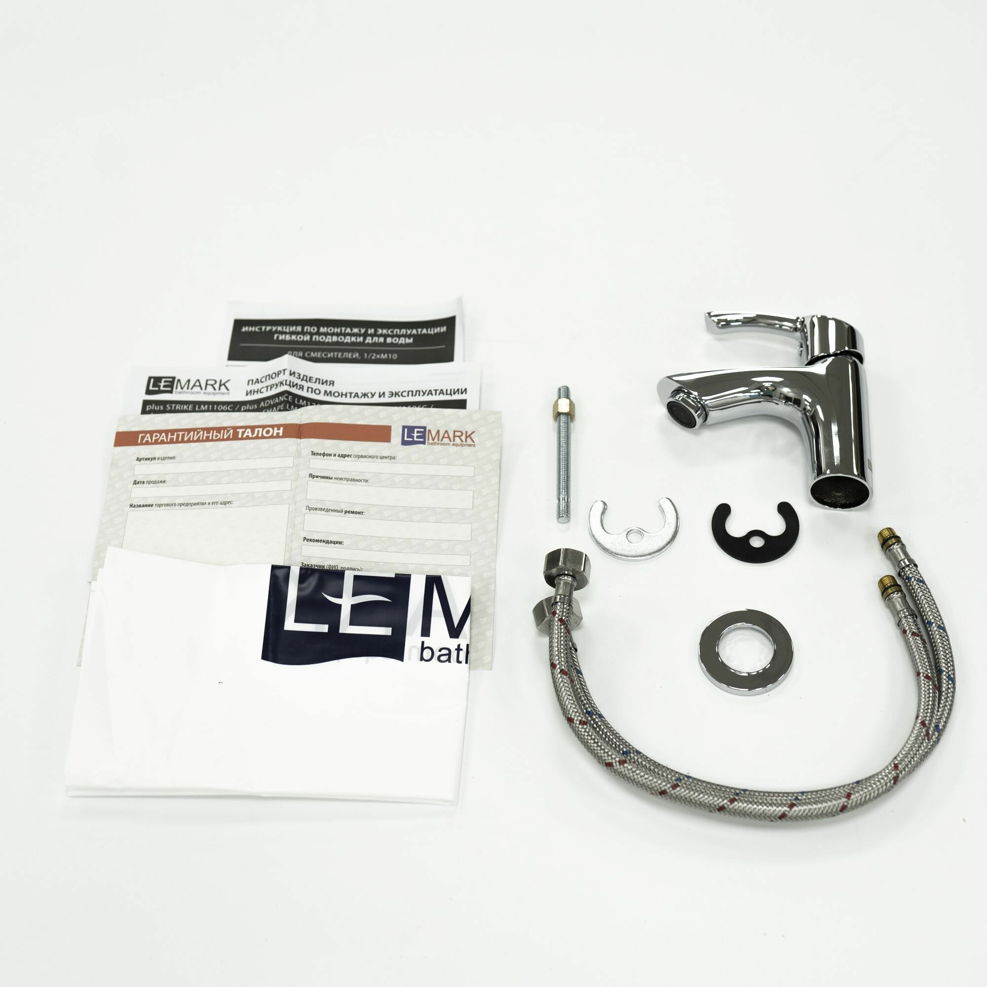 | Комплектация | смеситель - 1 шт, аэратор - 1 шт, керамический картридж - 1 шт, металлическая рукоятка - 1 шт, гибкая подводка - 1 шт |