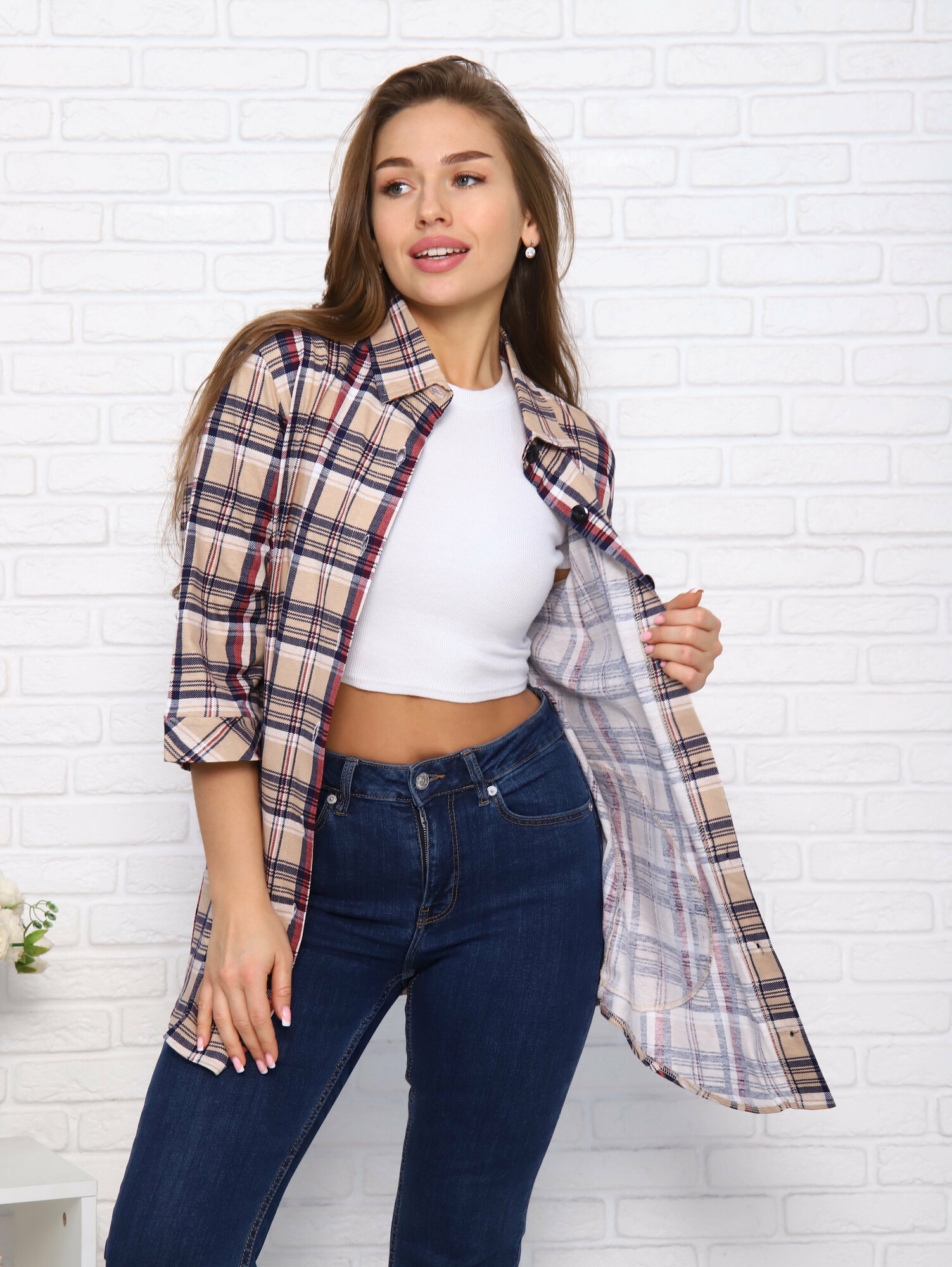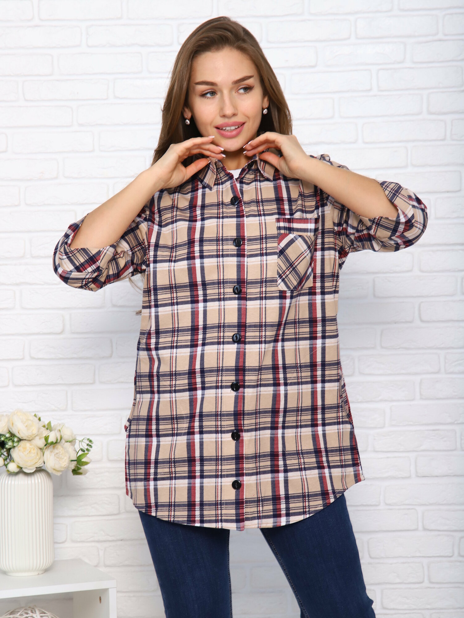 СохранитьТуника в клетку на пуговицах, Bentog, 48 размер, бежевый, синий В-03 интересное: