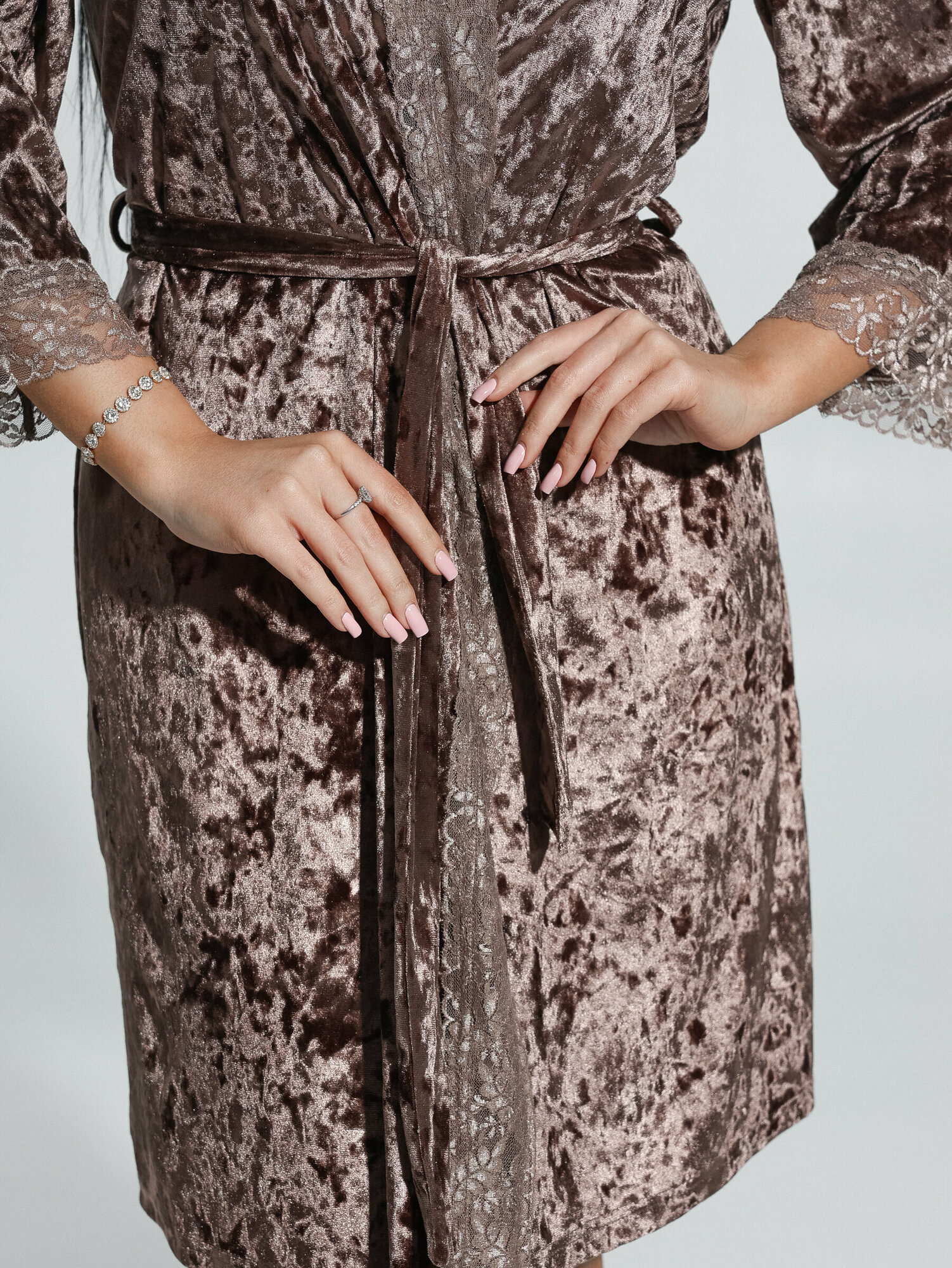 Lovetex.store / Пеньюар кружевной бархатный, халат + сорочка / кофе / размер 44