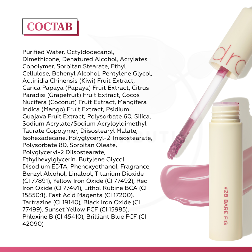 | Состав | Purified Water, Octyldodecanol, Dimethicone, Denatured Alcohol, Acrylates Copolymer, Sorbitan Stearate, Ethyl Cellulose, Behenyl Alcohol, Pentylene Glycol, Actinidia Chinensis (Kiwi) Fruit Extract, Carica Papaya (Papaya) Fruit Extract, Citrus Paradisi (Grapefruit) Fruit Extract, Cocos Nucifera (Coconut) Fruit Extract, Mangifera Indica (Mango) Fruit Extract, Psidium Guajava Fruit Extract, Polysorbate 60, Silica, Sodium Acrylate/Sodium Acryloyldimethyl Taurate Copolymer, Diisostearyl Malate, Isohexadecane, Polyglyceryl-2 Triisostearate, Polysorbate 80, Polyglyceryl-2 Diisostearate, Sorbitan Oleate, Ethylhexylglycerin, Butylene Glycol, Disodium EDTA, Phenoxyethanol, Fragrance, Benzyl Alcohol Linalool Titanium Dioxide (CI 77891), Red Iron Oxide (CI 77491), Lithol Rubine BCA (CI 15850:1), Tartrazine (CI 19140), Fast Acid Magenta (CI 17200), Yellow Iron Oxide (CI 77492), Black Iron Oxide (CI 77499), Fast Acid Magenta (CI 17200), Sunset Yellow FCF (CI 15985), Phloxine B (CI 45410) |