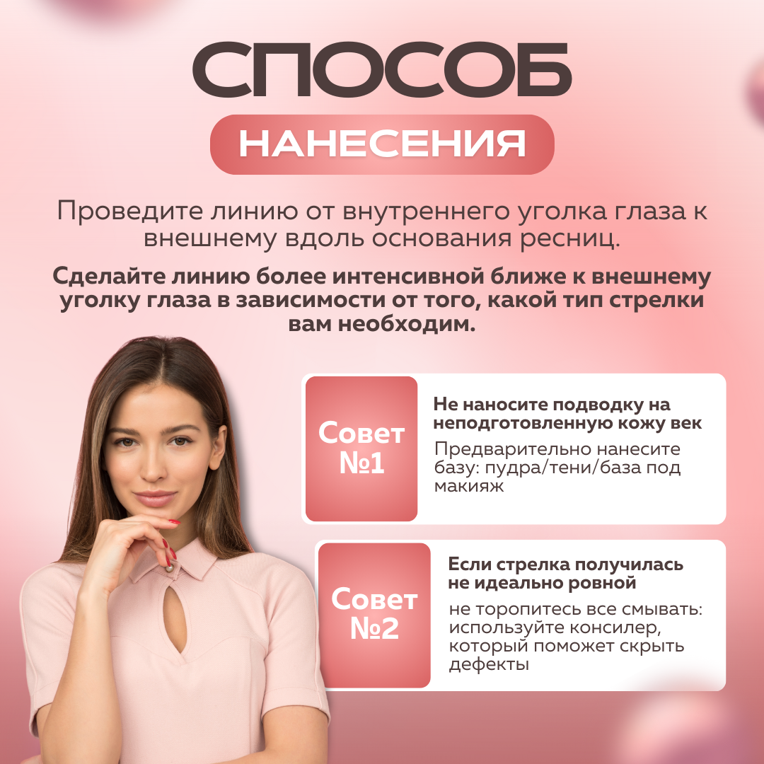 | Способ применения | Научиться рисовать стрелки с помощью такой подводки несложно. Важно учиться контролировать давление на аппликаторе и двигать его по глазу с легкостью. Для начала рекомендуется проводить линию от внешнего уголка глаза к внутреннему, постепенно увеличивая ее толщину и длину. Затем можно добавить стрелку, двигаясь от конца линии внутрь. Практика и терпение - вот основные компоненты успеха в создании красивых стрелок. |