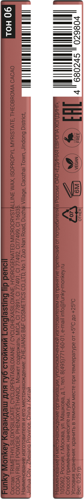 Ниже Вы можете прочитать отзывы на Funky Monkey Карандаш для губ стойкий Longlasting lip pencil тон 06, ознакомится с подробными характеристиками, посмотреть интересные обзоры и фотографии на Funky Monkey Карандаш для губ стойкий Longlasting lip pencil тон 06.
