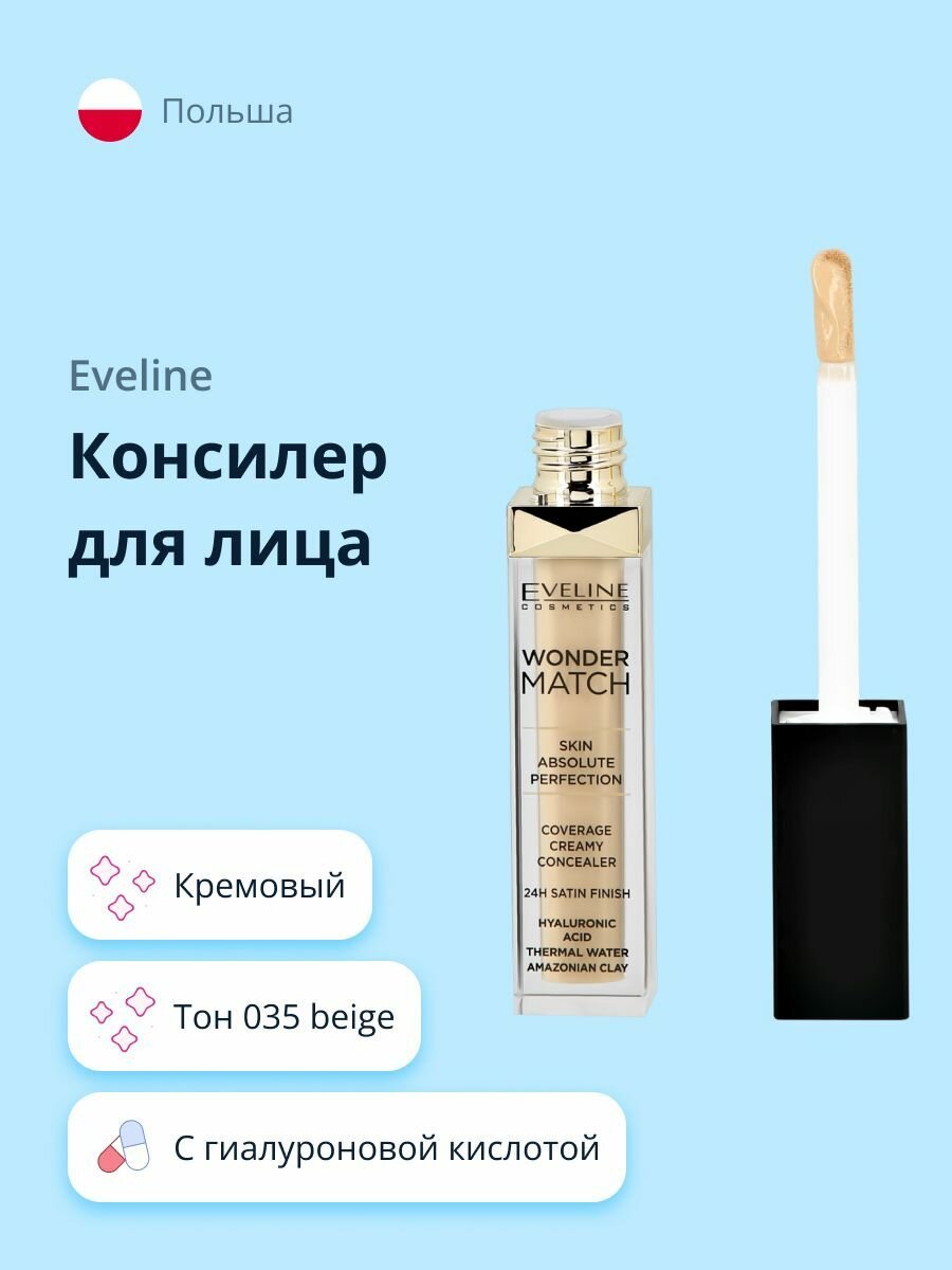 Консилер для лица `EVELINE` WONDER MATCH кремовый с гиалуроновой кислотой, тон 035 beige