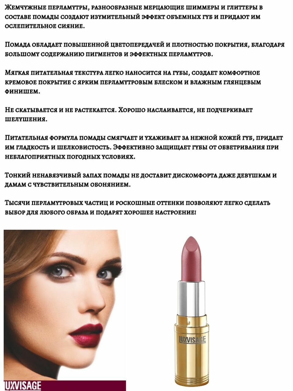 | Подробная комплектация | Помада для губ LUXVISAGE, перламутровая, тон 68, 1 уп |