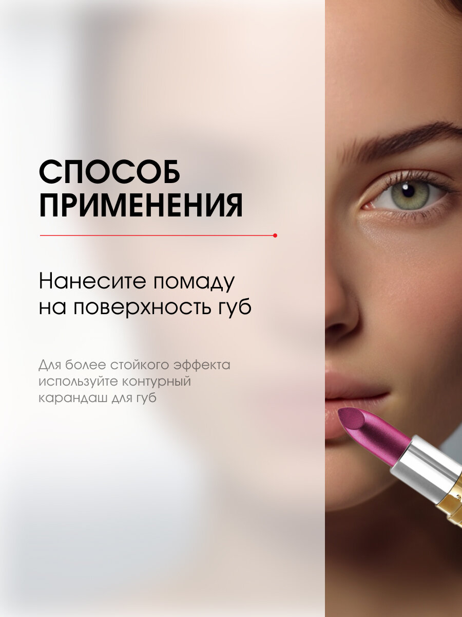 | Способ применения | нанесите помаду самостоятельно или с контурным карандашом. Для наилучшего результата используйте кисточку для губ |