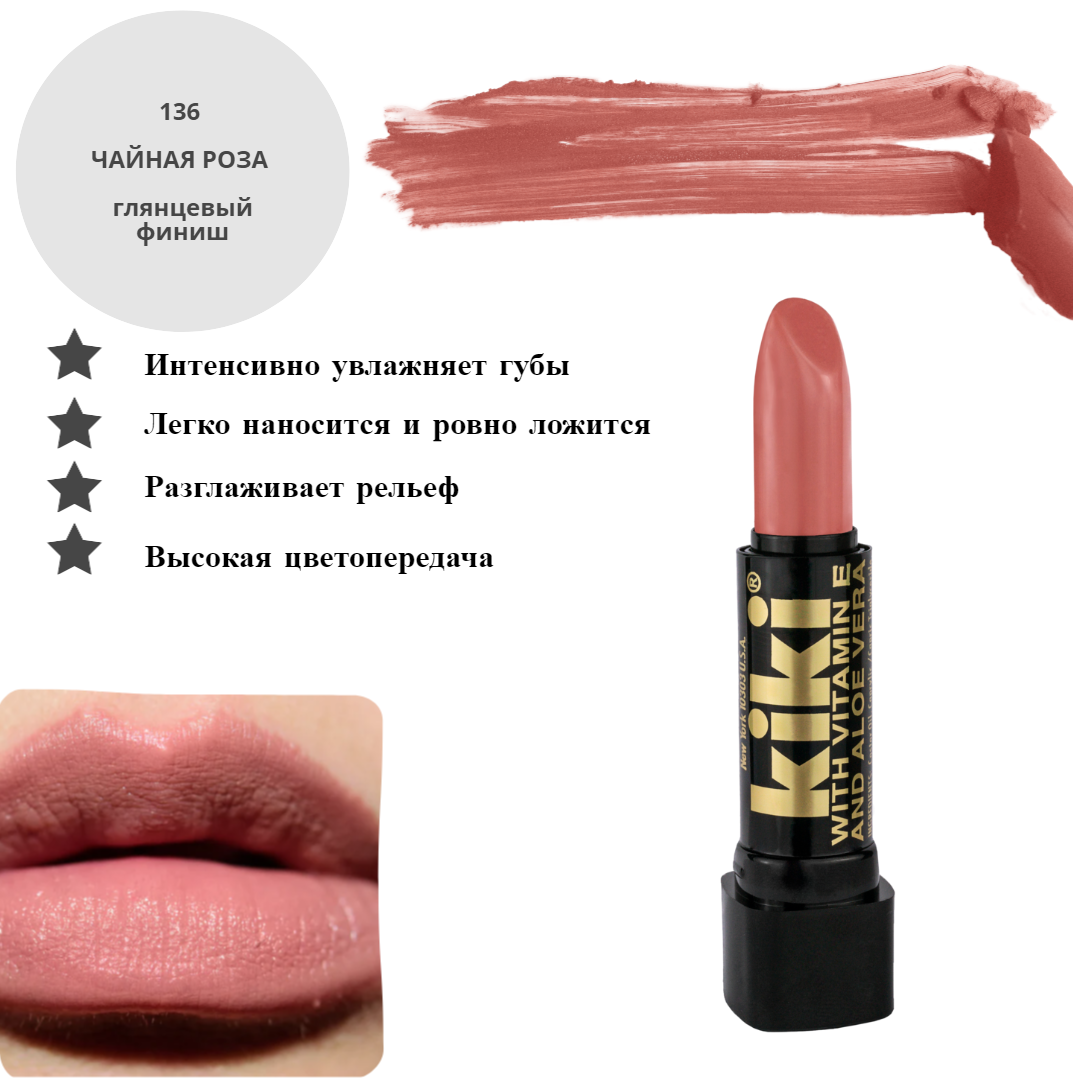 Помада для губ kiki с aloe & vit E тон 136 чайная роза стойкая увлажняющая глянцевая, кики