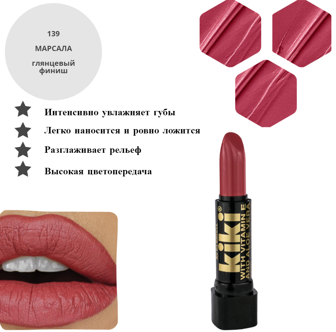 Помада для губ kiki с aloe & vit E тон 139 марсала, стойкая увлажняющая глянцевая с алоэ Кики