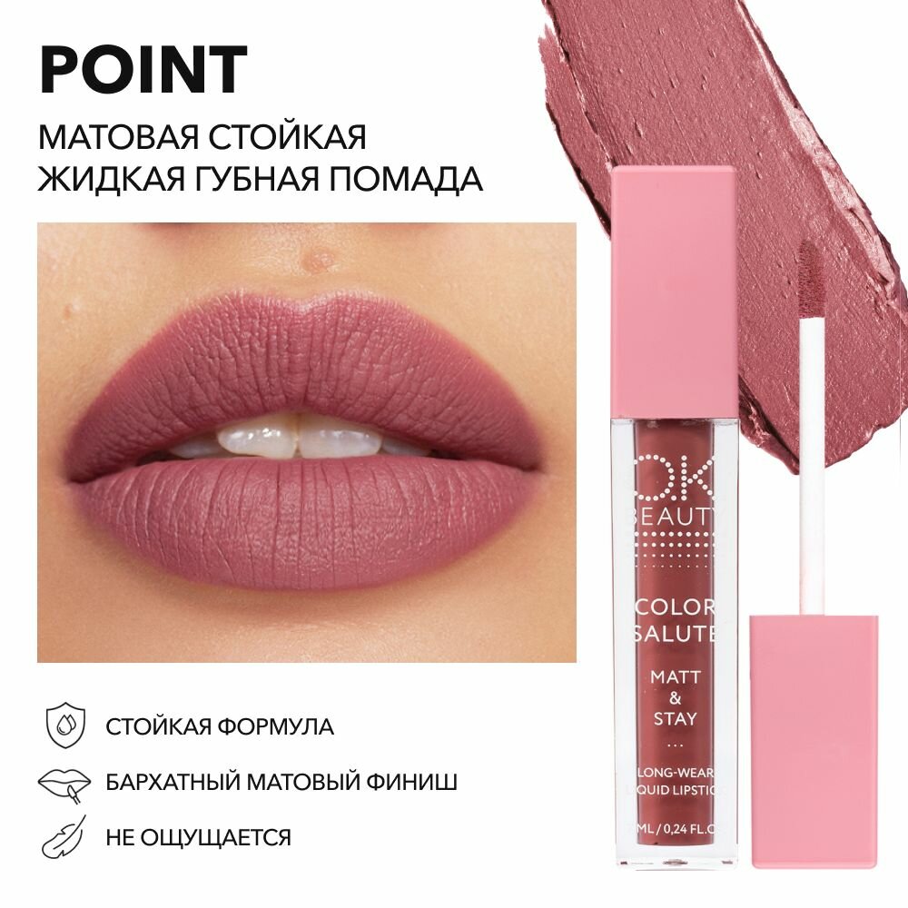 | Подробная комплектация | OK Beauty Помада для губ, матовая, стойкая, в оттенке Point (розово красный нюд) - 1 шт |