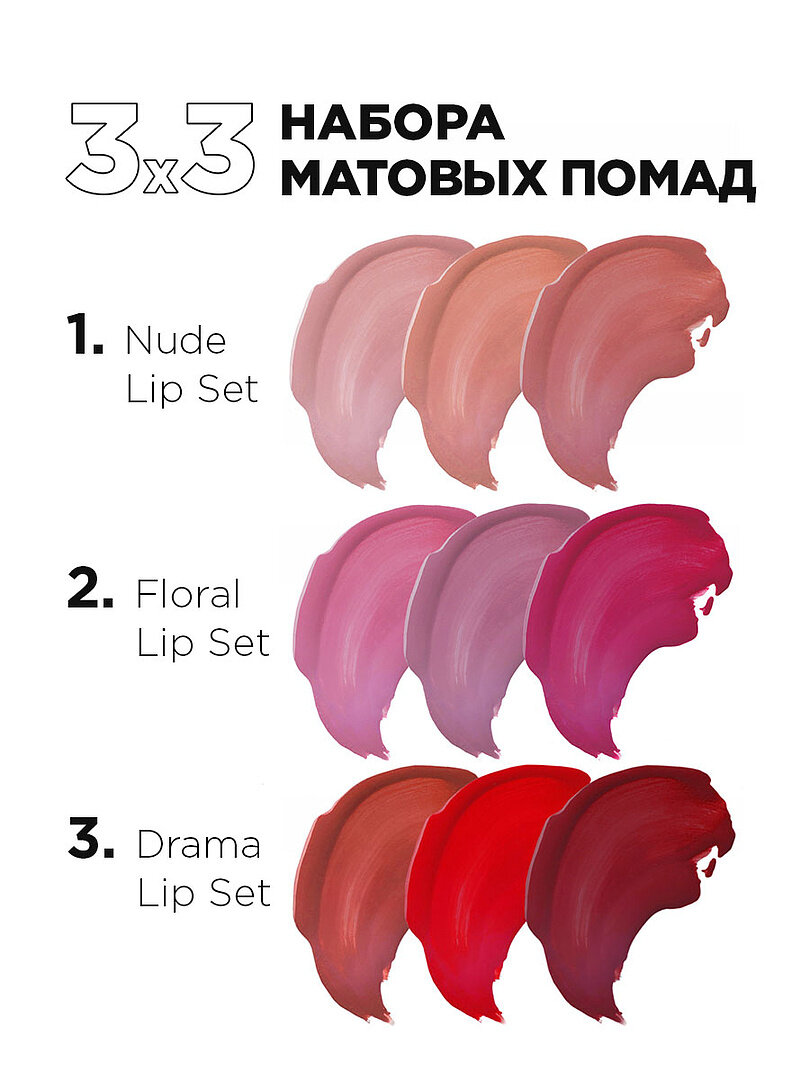 | Состав | Nude Lip Set набор матовых помад (помада 5 мл 201, 202, 203) |