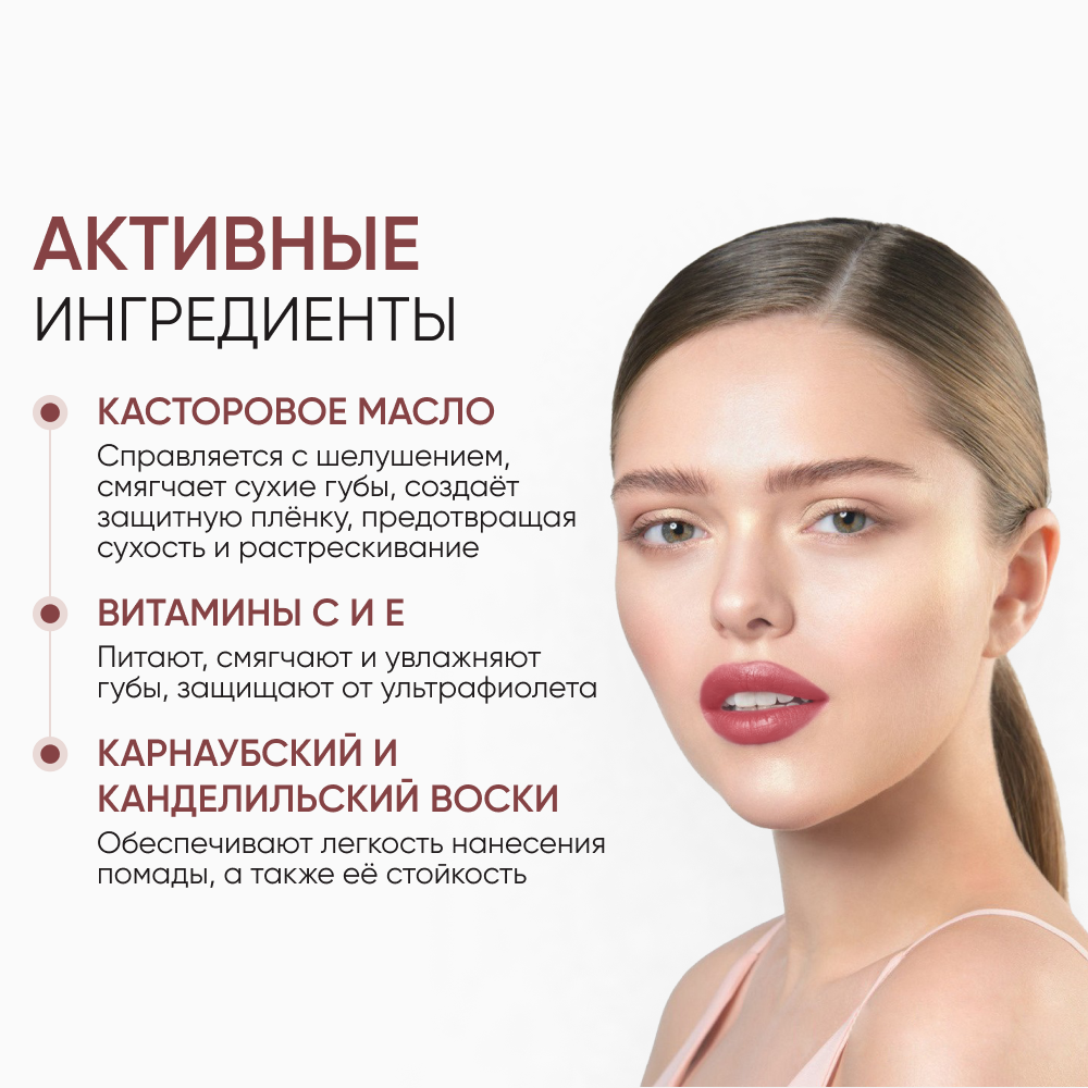| Способ применения | Начните нанесение от центра верхней губы по дуге купидона, затем двигайтесь по направлению к уголкам и заполните центр губ. Для более четкого точного контура и интенсивного цвета используйте карандаш для губ. |