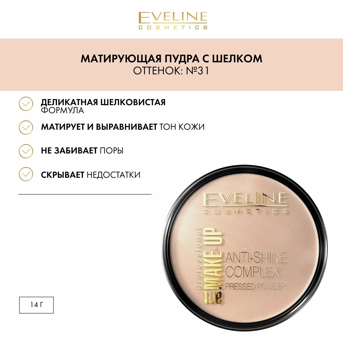 EVELINE Пудра для лица ANTI-SHINE COMPLEX PRESSED POWDER матирующая минеральная с шелком №31 TRANSPARENT, 14 гр