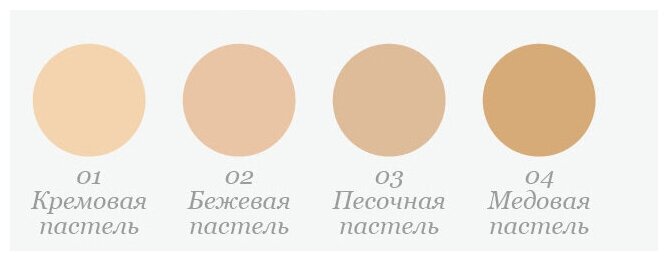 | Цвет товара | 01 кремовая пастель, 02 бежевая пастель, 03 песочная пастель, 04 медовая пастель |