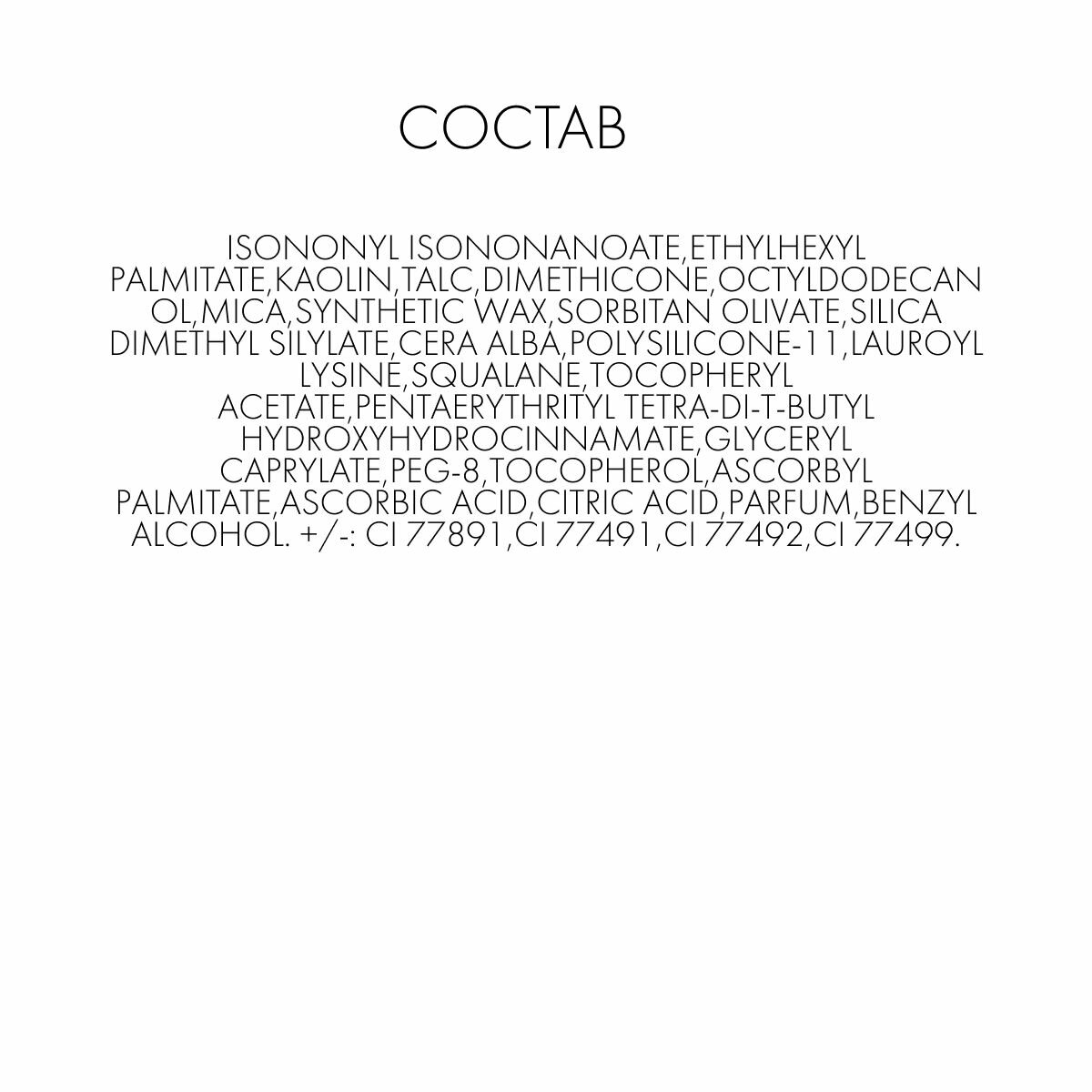 | Состав | Isononyl Isononanoate,Ethylhexyl Palmitate,Kaolin,Talc,Dimethicone,Octyldodecanol,Mica,Synthetic Wax,Sorbitan Olivate,Silica Dimethyl Silylate,Cera Alba,Polysilicone-11,Lauroyl Lysine,Squalane,Tocopheryl Acetate,Pentaerythrityl Tetra-di-t-butyl Hydroxyhydrocinnamate,Glyceryl Caprylate,PEG-8,Tocopherol,Ascorbyl Palmitate,Ascorbic Acid,Citric Acid,Parfum,Benzyl Alcohol. +/-: CI 77891,CI 77491,CI 77492,CI 77499. |