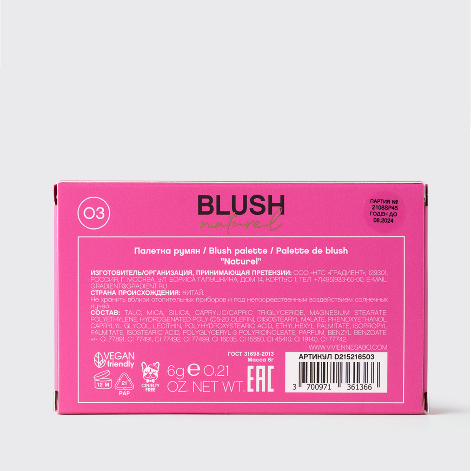 Палетка румян Vivienne Sabo Naturel, тон 02 Розовый, 6 гр