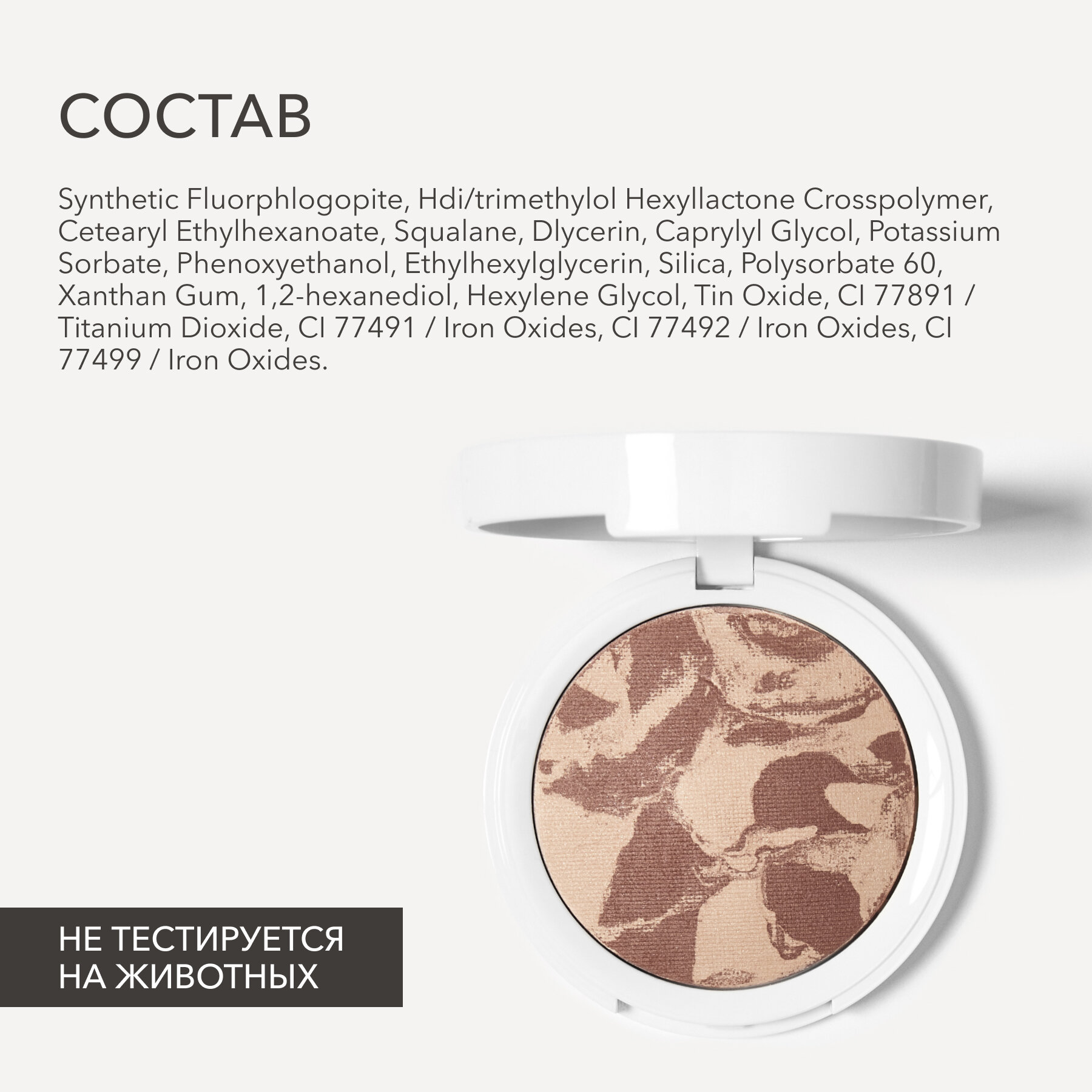| Состав | synthetic fluorphlogopite, hdi/trimethylol hexyllactone crosspolymer, cetearyl ethylhexanoate, squalane, dlycerin, caprylyl glycol, potassium sorbate, phenoxyethanol, ethylhexylglycerin, silica, polysorbate 60, xanthan gum, 1,2-hexanediol, hexylene glycol, tin oxide, ci 77891 / titanium dioxide, ci 77491 / iron oxides, ci 77492 / iron oxides, ci 77499 / iron oxides |