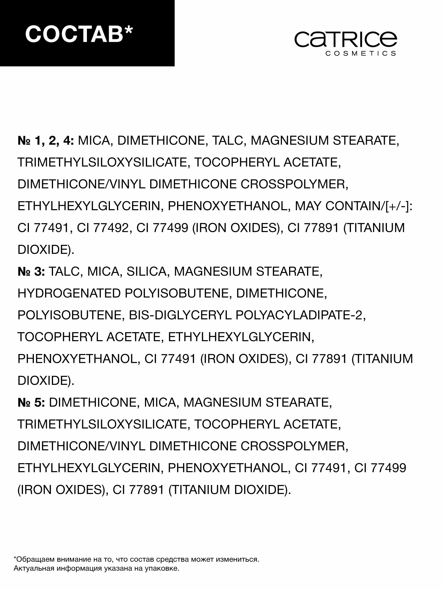 | Состав | mica, dimethicone, talc, magnesium stearate, trimethylsiloxysilicate, disiloxane, dimethicone/vinyl dimethicone crosspolymer, rosa damascena flower oil, tocopheryl acetate, ethylhexylglycerin, phenoxyethanol, ci 77491, ci 77492, ci 77499 (iron oxides), ci 77891 (titanium dioxide). and/und ingredients: talc, mica, magnesium stearate, silica, dimethicone, hydrogenated polyisobutene, polybutene, bis-diglyceryl polyacyladipate-2, rosa damascena flower oil, tocopheryl acetate, ethylhexylglycerin, phenoxyethanol, may contain/[+/-]: ci 16035 (red 40 lake), ci 75470 (carmine), ci 77007 (ultramarines), ci 77491, ci 77492, ci 77499 (iron oxides), ci 77891 (titanium dioxide). and/und ingredients: dimethicone, mica, talc, magnesium stearate, trimethylsiloxysilicate, disiloxane, dimethicone/vinyl dimethicone crosspolymer, rosa damascena flower oil, tocopheryl acetate, ethylhexylglycerin, phenoxyethanol, ci 75470 (carmine), ci 77491, ci 77492, ci 77499 (iron oxides), ci 77891 (titanium dioxide) |