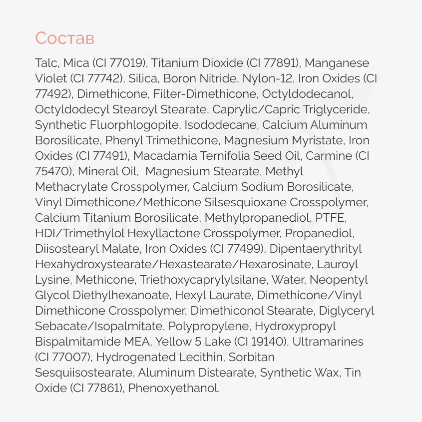 | Состав | Dimethicone, Synthetic Fluorphlogopite, Calcium Titanium Borosilicate, Isododecane, Calcium Aluminum Borosilicate, Titanium Dioxide (CI 77891), Methyl Methacrylate Crosspolymer, Vinyl Dimethicone/Methicone Silsesquioxane Crosspolymer, Neopentyl Glycol Diethylhexanoate, Nylon-12, Hexyl Laurate, Dimethicone/Vinyl Dimethicone Crosspolymer, Magnesium Myristate, Diglyceryl Sebacate/Isopalmitate, Polypropylene, Silica, Sorbitan Sesquiisostearate, Dipentaerythrityl Hexahydroxystearate/Hexastearate/Hexarosinate, Aluminum Distearate, Propanediol, PTFE, Synthetic Wax, Triethoxycaprylylsilane, Tin Oxide (CI 77861), Phenoxyethanol, Yellow 5 Lake (CI 19140), Red 30 (CI 73360), Iron Oxides (CI 77491), Iron Oxides (CI 77499) |