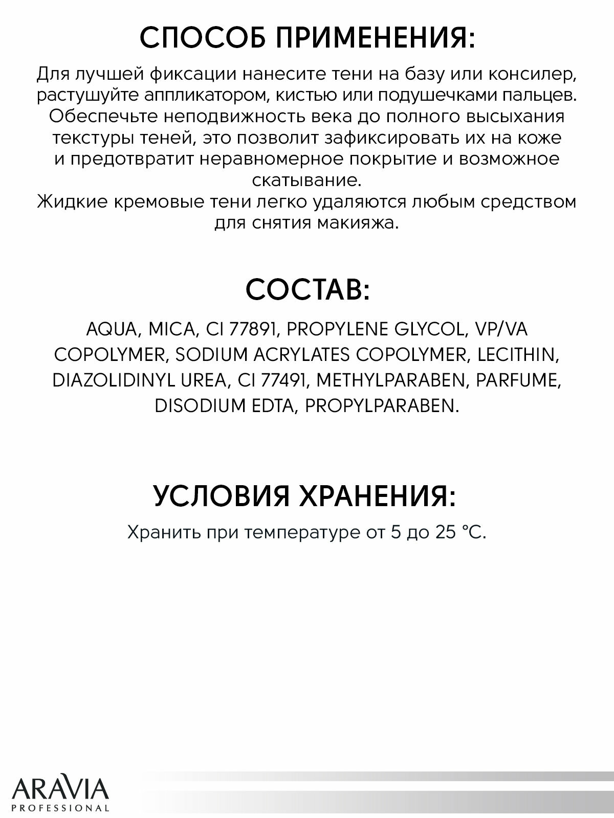 | Способ применения | Для лучшей фиксации нанесите тени на базу или консилер, растушуйте аппликатором, кистью или подушечками пальцев. После распределения теней и растушевки обеспечьте неподвижность века до полного высыхания текстуры. Это позволит зафиксировать тени на коже и предотвратит неравномерное покрытие и возможное скатывание. Жидкие кремовые тени легко удаляются любым средством для снятия макияжа. |