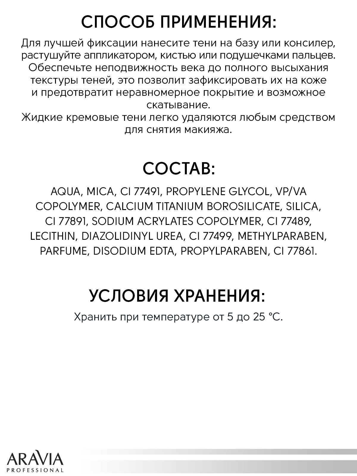 | Способ применения | Для лучшей фиксации нанесите тени на базу или консилер, растушуйте аппликатором, кистью или подушечками пальцев. После распределения теней и растушевки обеспечьте неподвижность века до полного высыхания текстуры. Это позволит зафиксировать тени на коже и предотвратит неравномерное покрытие и возможное скатывание. Жидкие кремовые тени легко удаляются любым средством для снятия макияжа. |