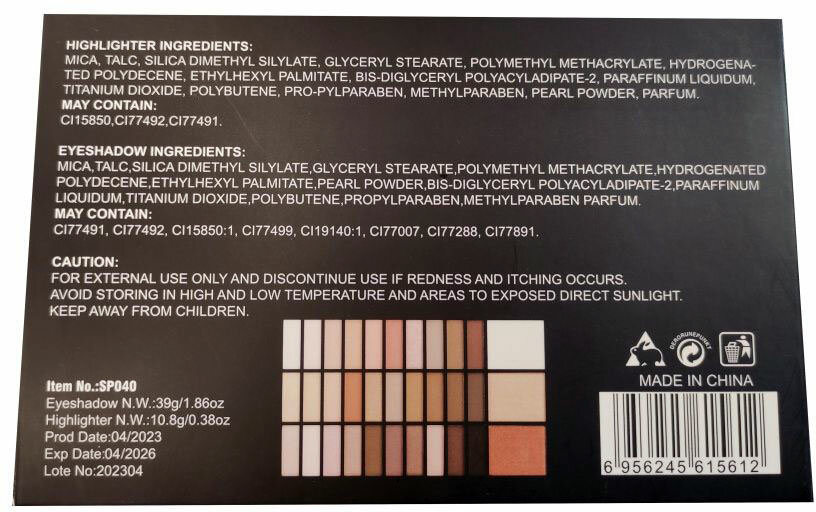 | Состав | слюда, тальк, диметилсилилат диоксида кремния, глицерилстеарат, полиметилметакрилат, гидрогенизированный полидецен, этилгексилпальмитат, жемчужная пудра, бис-диглицерилполиациладипат-2, жидкий парафин, диоксид титана, полибутен, пропилпарабен, метилпарабен, отдушка, CI15850, CI15850:1, CI19140:1, CI77007, CI77288, CI77491, CI77492, CI77499, CI77891 |