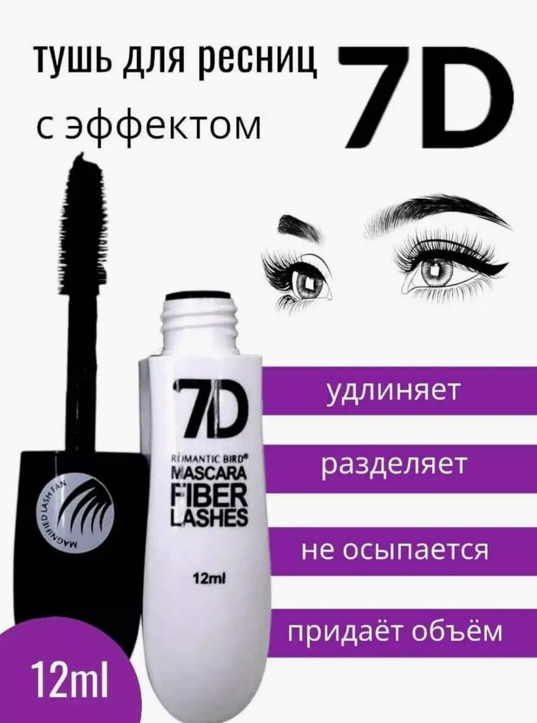 Тушь для ресниц удлинение и объем Mascara Fiber Lashes 7D 12ml интересное: