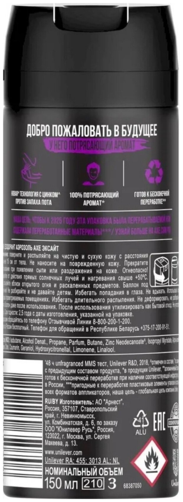 | Состав | Isobutane, Alcohol Denat, Propane, Butane, Parfum, Amyl Cinnamai, Citral, Citronellol, Coumarin, Geraniol, Limonene, Linalool. |