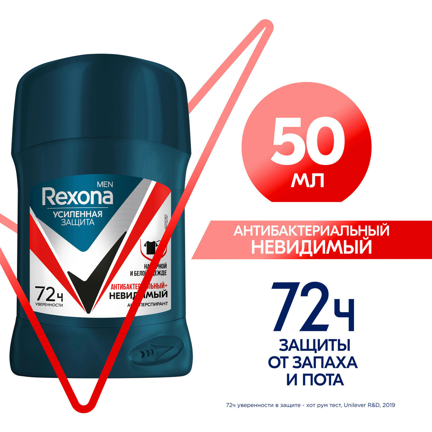 Дезодорант мужской твердый стик антиперспирант Рексона Антибактериальный и Невидимый на черной и белой одежде, 50 мл