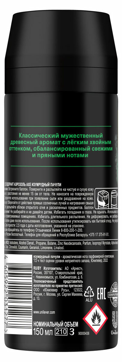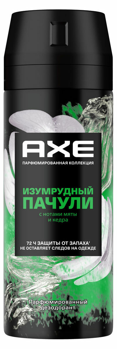 Парфюмированный дезодорант аэрозоль AXE Изумрудный пачули 72ч защиты от пота и запаха 150 мл