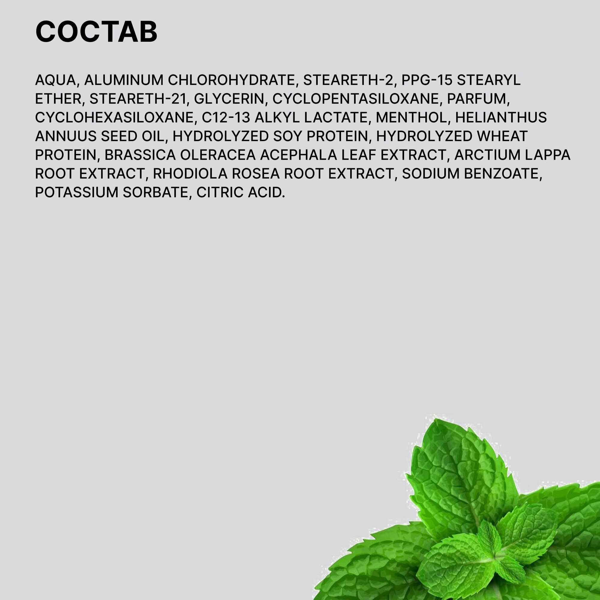 | Состав | Вода, хлоргидрат алюминия, Стеарет-2, стеариловый эфир PPG-15, Стеарет-21, Глицерин, Циклопентасилоксан, Парфюмерная вода, Циклогексасилоксан, алкиллактат С12-13, Ментол, Масло семян подсолнечника, гидролизованный соевый белок, гидролизованный пшеничный белок, Экстракт листьев броколли, экстракт корня лопуха, Родиола розовая, бензоат натрия, сорбат калия, Лимонная кислота. |