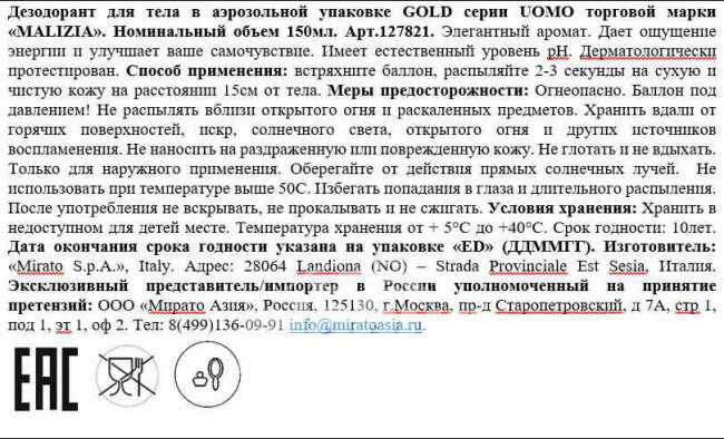 MALIZIA Дезодорант мужской aэрозоль GOLD 150 мл интересное: