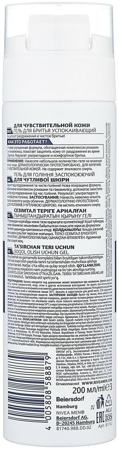 Гель для бритья успокаивающий Nivea Men для чувствительной кожи, без содержания спирта, 200 мл.