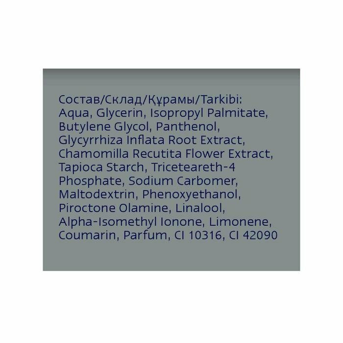 | Состав | вода, глицерин, изопропилпальмитат, бутиленгликоль, пантенол, экстракт корня глицирризы надувной, экстракт цветков ромашки обыкновенной, крахмал тапиоки, трицетирет-4 фосфат, карбомер натрия, мальтодекстрин, феноксиэтанол, пироктон оламин, линалоол, альфа-изометил ионон, лимонен, кумарин, парфюм, ci 10316, ci 42090 |